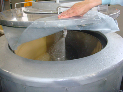 (本洗)高速遠心分離機で、8分間ソフター液を噴霧、汚れを分離します。